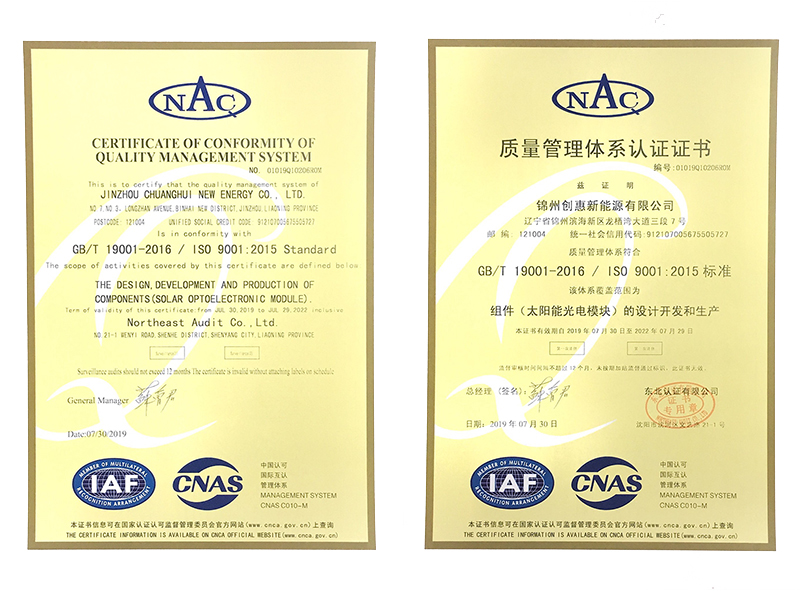 2019年7月30日,锦州阳光能源有限公司全资子公司锦州创惠新能源有限公司喜获质量体系认证证书