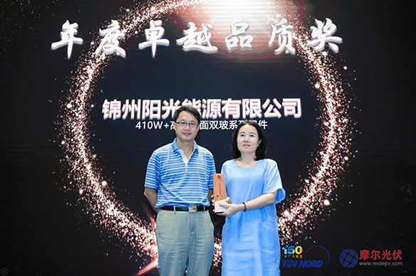 2019年8月22日,由TüVNORD和摩尔光伏主办的第二届双面双玻与平价上网技术路线研讨会在苏州召开,同时举行了“2019光伏技术风向奖”颁奖典礼。 “光伏技术风向奖”旨在鼓励光伏企业在推动光伏行业技术进步,促进光伏行业技术水平的提高与创新。众多企业高管、行业专家、媒体代表约200余人参与了此次盛会,见证了这一光荣时刻。锦州阳光能源的410W+高效双面双玻组件凭借优秀的产品性能荣获“