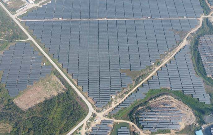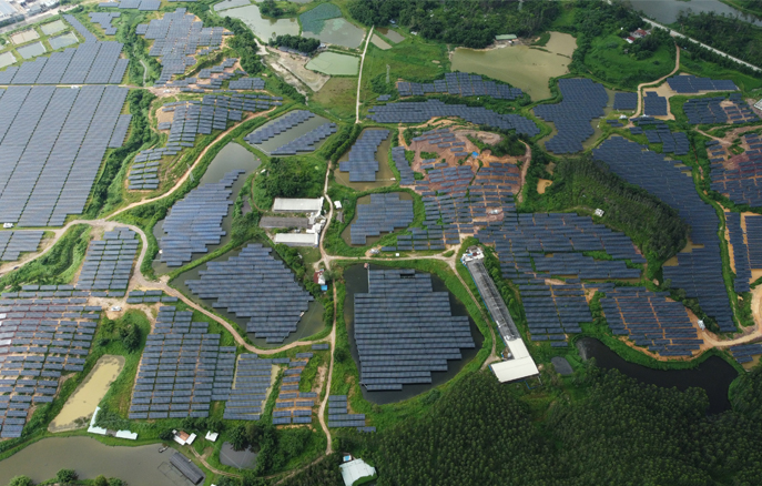 值得一提的是,广东省开平市150MW光伏项目综合采用了“农光互补+渔光互补”新型发电模式——板上光伏发电,板下土地进行农业种植、板下水域进行渔业养殖——满足周边用电需求的同时,还实现了电力与农业、渔业的有机结合,实现三重经济收益。从高空俯瞰,耕地、渔田与阳光组件交相辉映,波澜壮阔。