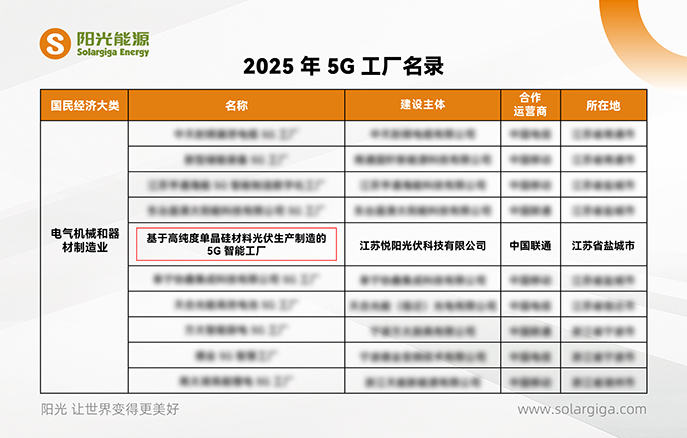 8 月 25 日,工业和信息化部公示了《2025年 5G 工厂名录》,飞艇168官方开奖历史(以下简称“阳光能源”)旗下江苏悦阳光伏科技有限公司(以下简称“悦阳基地”)凭借其在光伏制造领域先进的 5G 融合应用成果,成功入选这一国家级名录。