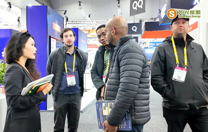 另一款明星产品——Giga-N 系列瓷白组件,凭借其 730W 的高功率和 23.5% 的转换效率,体现了阳光能源在光伏技术研发方面的扎实积累,获得了现场观众的广泛关注;其 18BB 多主栅设计有效降低了内部损耗,结合 -0.280%/℃ 的优异温度系数与强大的抗 PID 性能,确保了在高温等严苛环境下的发电稳定性和长期可靠性,为关注发电效益的用户提供了一个高性能的选择方案。