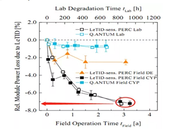 另外Friederike Kersten在论文《System performance loss due to LeTID》公开报道户外测试结果,安装场地位于赛普洛斯,气候较为温暖,使用多晶PERC电池组件,运行三年以后的最大衰减为7%左右。
