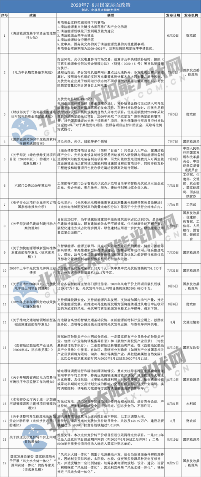 国家层面,7、8月份共发布19项光伏政策,涉及可再生能源电价补贴、光伏竞/平价政策、电力市场交易、BIPV、风光储一体化项目等多个方面。