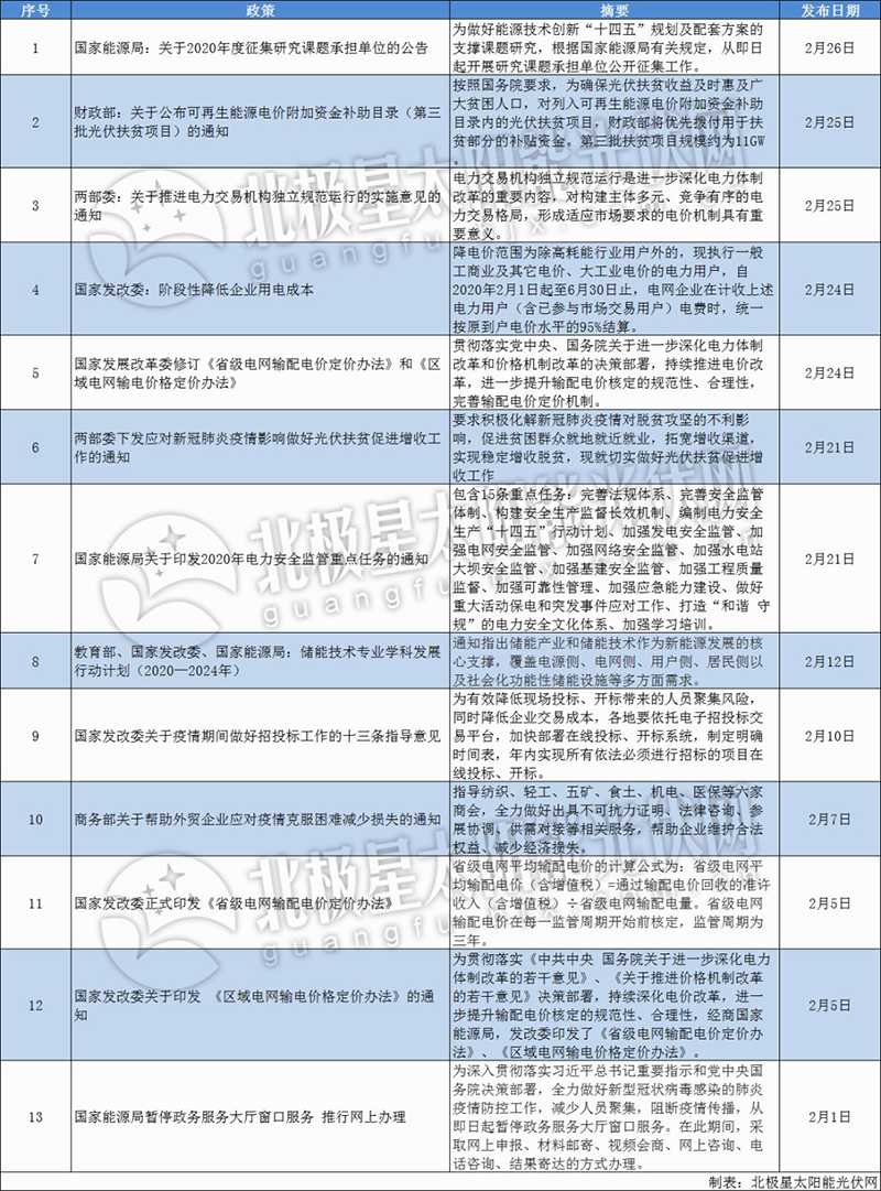 由此,北極星太陽能光伏網梳理了2月光伏政策,其中國家層面共出臺13項,涉及光伏扶貧、電力交易、電力安全等;地方層面共21項,涉及平價上網、光伏補貼、分佈式光伏、BIPV等多個方面。